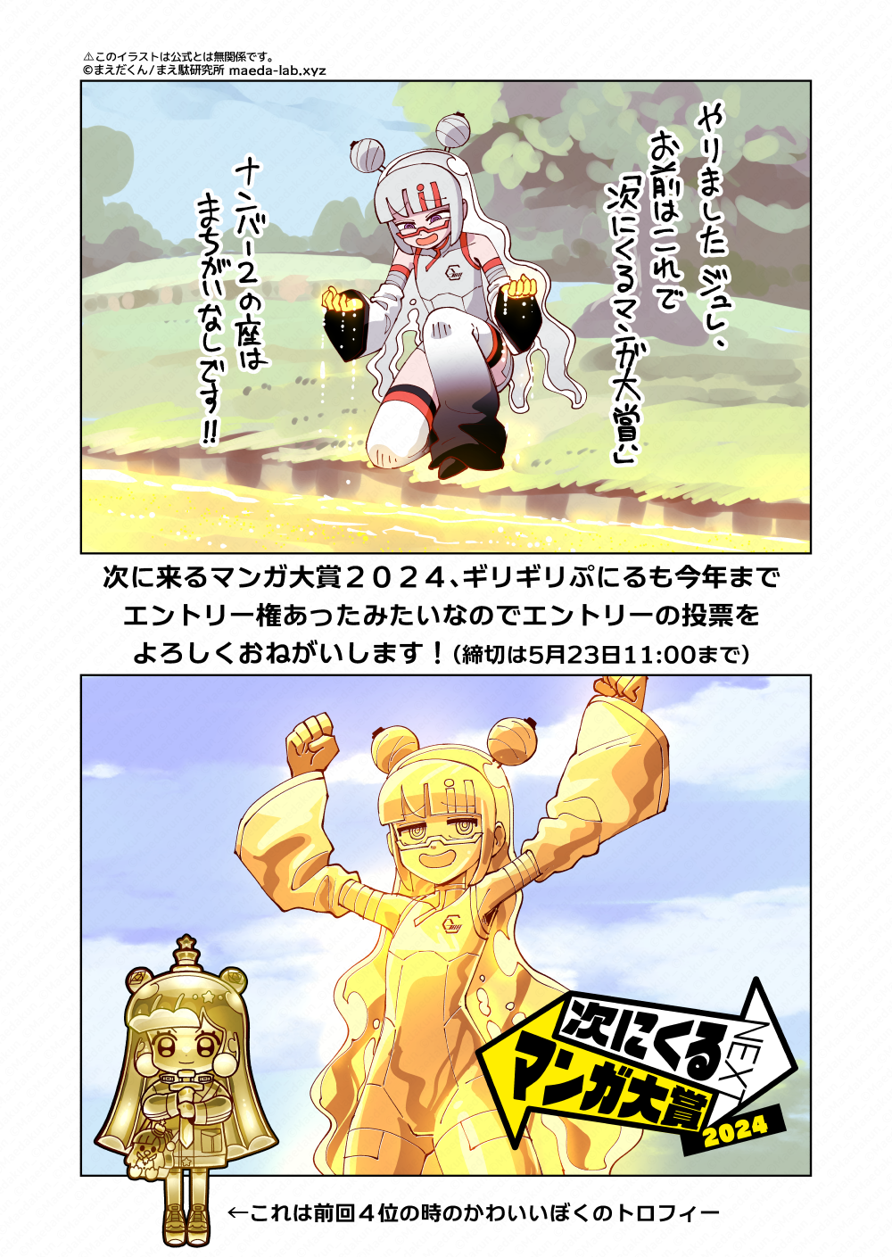投票終了前日に打ち合わせ中にぷにるもまだギリギリエントリーできる資格があったことが判明したので、一応告知絵描いておいてくださいと担当さんに頼まれたので描きました。